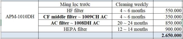 - Màng lọc HEPA. Thời gian thay thế: 12 tháng