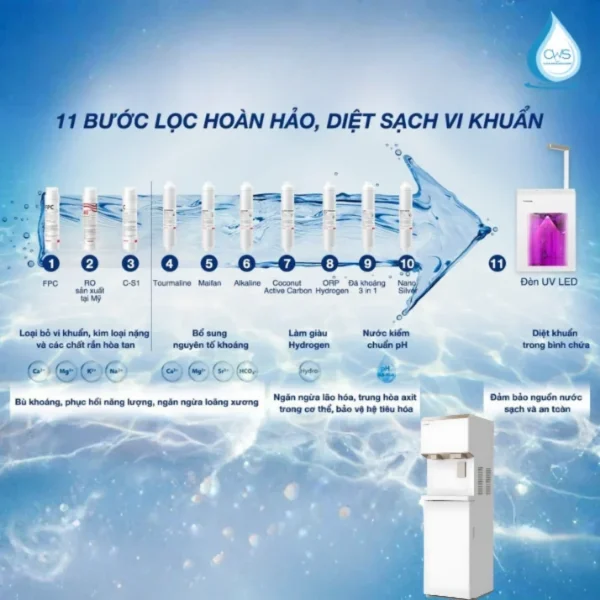 Hệ thống bắt đầu từ lõi FPC loại bỏ tạp chất lớn và gỉ kim loại, sau đó màng RO chính lọc 99.99% virus, vi khuẩn, kim loại nặng, chất rắn hòa tan. Lõi C tiếp theo khử màu, mùi vị lạ, trong khi các lõi chức năng như Tourmaline tạo ion âm, Maifan, Alkaline bổ sung kiềm tăng pH, Coconut Active Carbon khử clo, ORP Hydrogen chống oxy hóa, đá khoáng 3in1 chiết xuất vi khoáng, và Nano Silver diệt khuẩn cuối cùng. Toàn bộ quy trình giữ khoáng tự nhiên, tạo nước giàu Hydrogen hỗ trợ miễn dịch.